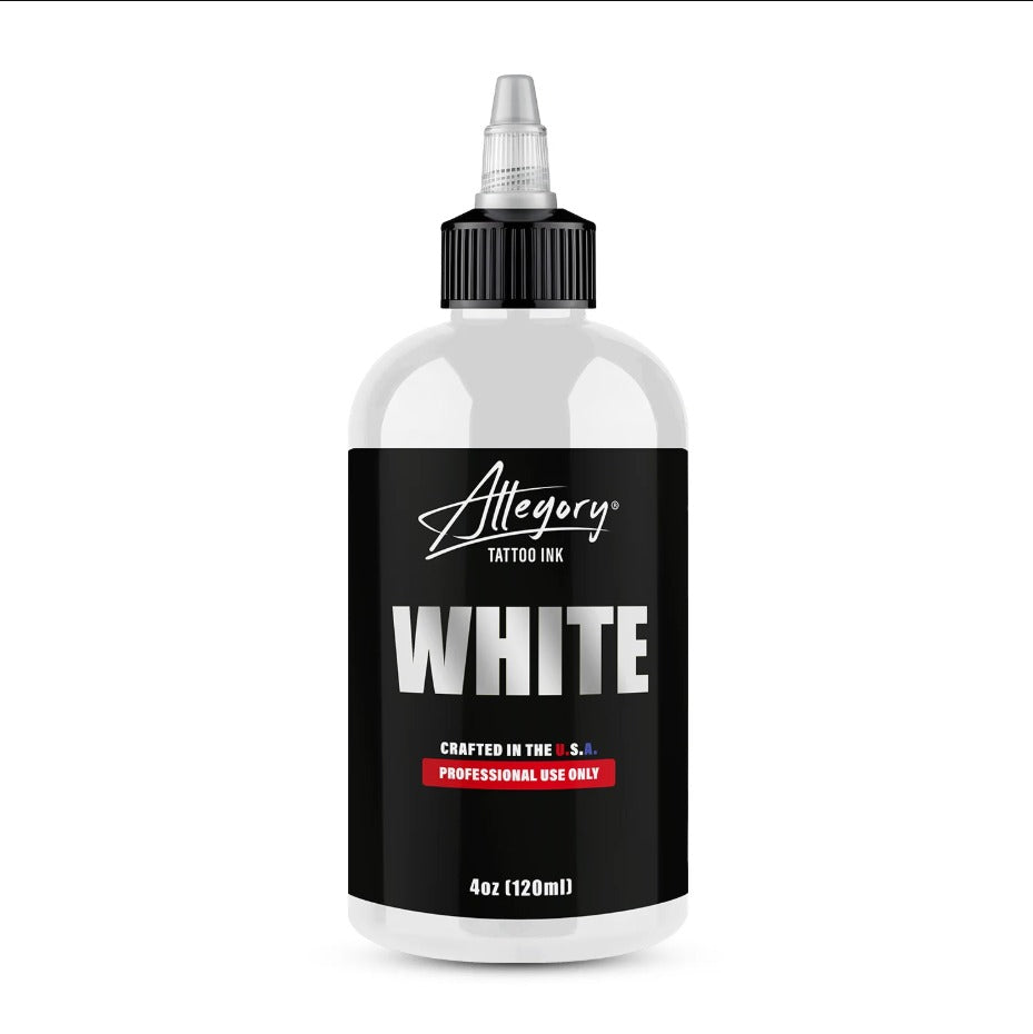 "Allegory White is a smooth, consistent blend of liquid dispersed pigment. This pure white ink comes in a PET Clear Squat Boston Round bottle. Each bottle is heat sealed with a tamper resistant twist-dispensing top." Lot and Expiration are printed on every bottle.
