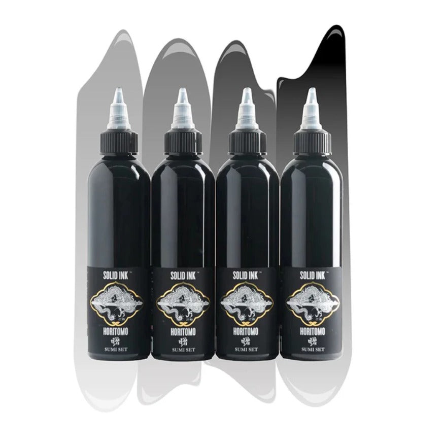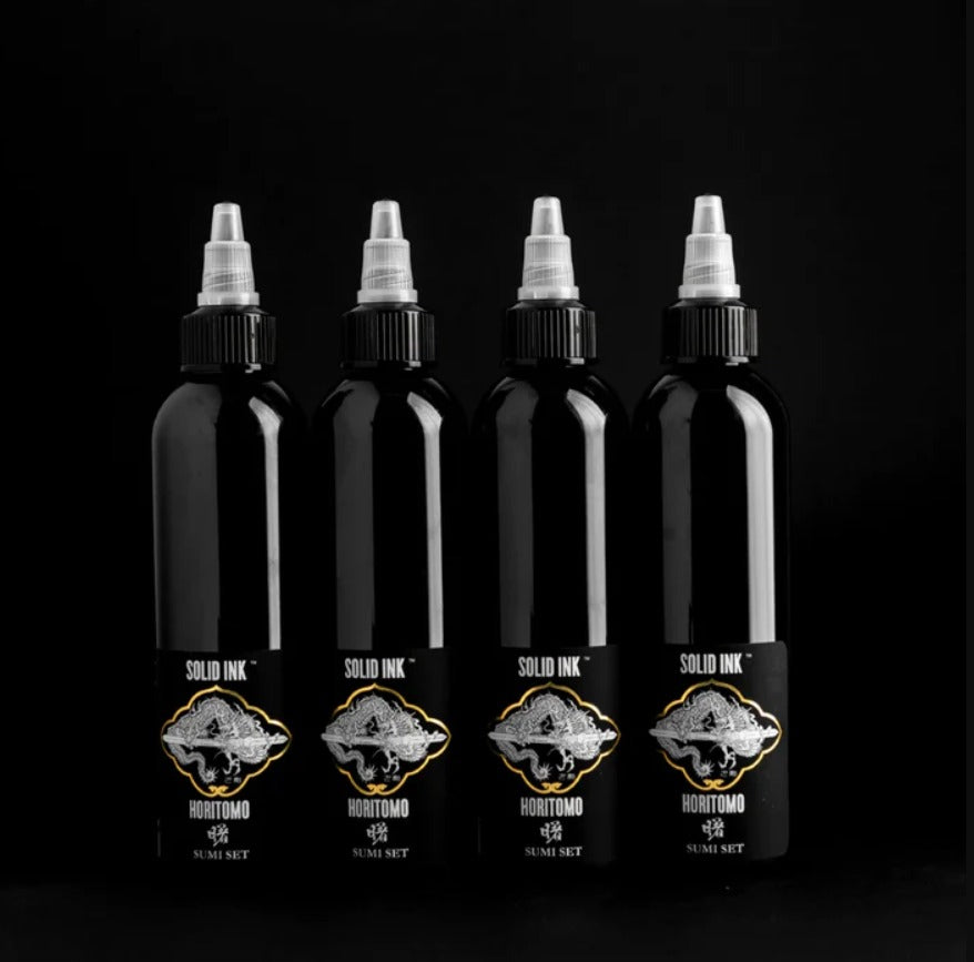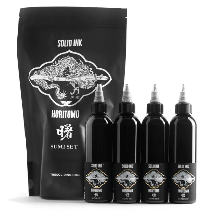 Horitomo is a San Jose, California-based tattoo artist with over twenty years of experience in Japanese traditional work including tebori (Japanese hand tattooing). Packaged in a custom Horitomo bag, the Horitomo Sumi Set includes four Sumi shades in 2oz bottles that can be used to achieve perfect tones for Japanese-style backgrounds and black and grey work. Each pigment is developed, used, and favored by artist Horitomo himself; enjoy his hand-picked inks at your needle tips for an ideal traditional Japanese tattoo composition."
